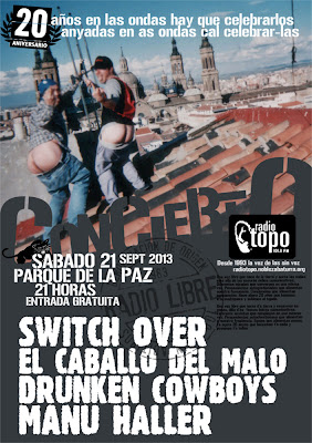 Ya intentamos tocar para esta radio libre en el mismo sitio hace cuatro o cinco años, pero el excrecentísimo ayuntamiento de Zaragoza decretó lluvia y se jodió la fiesta. Esta vez lo intentaremos con otras tres bandas: Switch Over, unos punroqueros de Zaragoza que no cantan en cristiano; los Drunken Cowboys, desde el lejano oeste con sombreros y todo; y con Manuel Haller, rapero madalenero que presenta sus Anotaciones II.